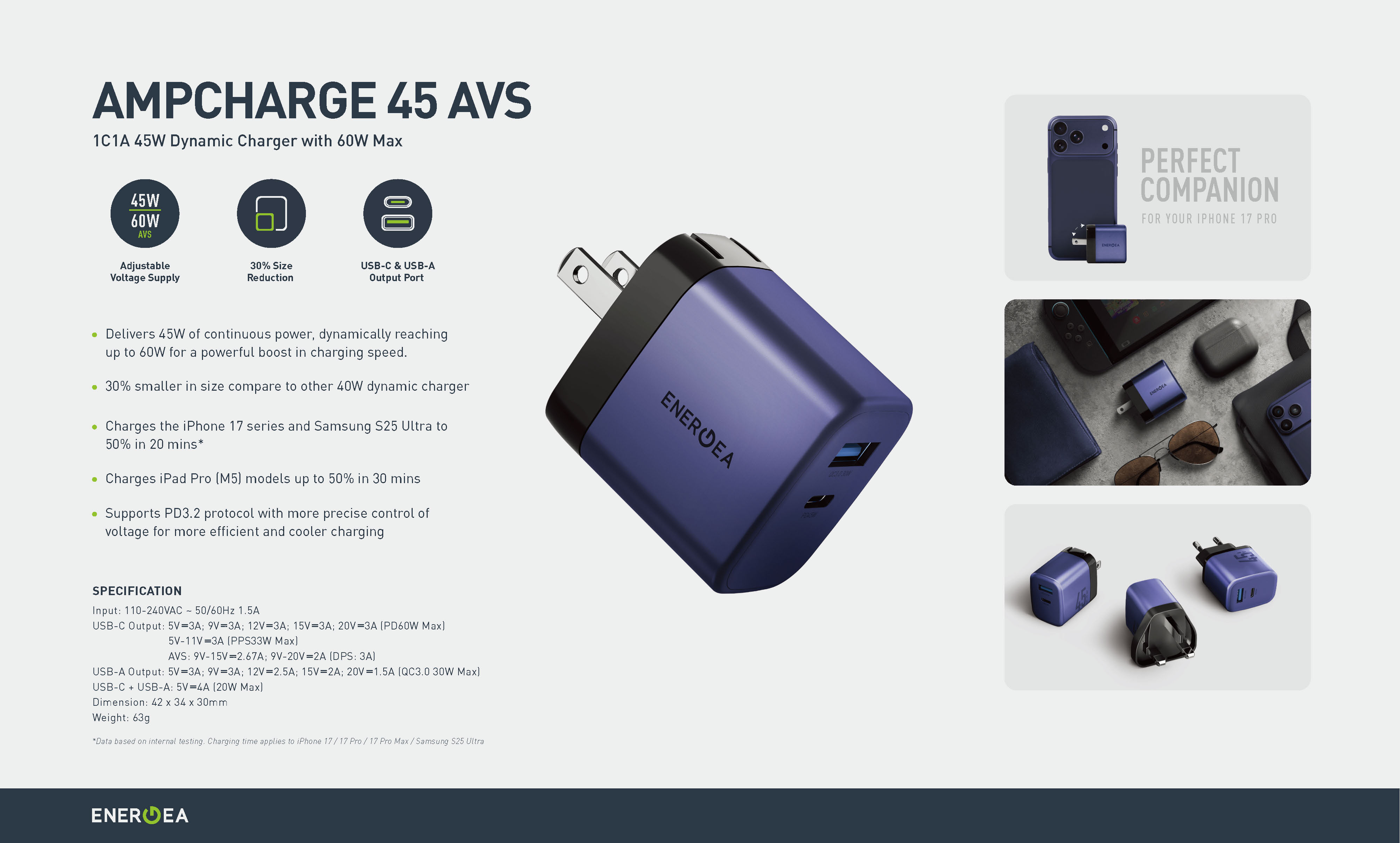 ※ 20 分鐘即可將 iPhone 17 系列和三星 S25 Ultra 充電至 50%